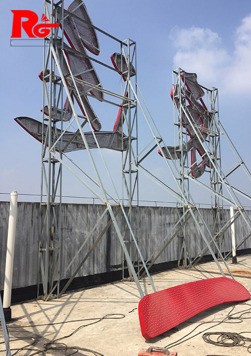 2,楼顶的结构,大多数楼顶结构是没有受力点预埋件,即没有为长沙楼顶发光字做设计,长沙楼顶发光字钢结构与楼顶部无法结构焊接(楼层顶部是不能破坏,防止漏水),在这种情况下,就要做配重,即用配重的重量来承担长沙楼顶字所受的风力,简单的说就是用混凝土压住钢结构的受力点。